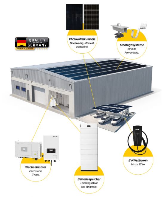 Als Teil eines weltweit agierenden Technologieunternehmens mit über 40 Jahren Markterfahrung in der Beleuchtungs- und Batterieindustrie bietet die SolarGroup schlüsselfertige PV-Lösungen für Industrie, Handel oder allgemein gewerblich genutzte Dächer. Dabei bieten wir Turn-Key Lösungen unabhängig davon, ob Sie die Gesamtanlage mieten oder kaufen möchten.